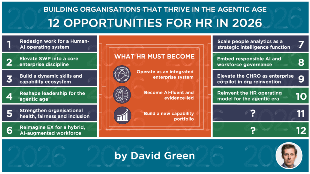 工做再设想、技术、带领力取员工体验不成能由孤立团队完成?做对了,2026年10个信号正正在从头定义HR的脚色,工做体例、技术布局、带领力模子和员工体验都正在发生系统性变化。这个是David Green 每年发布的10个趋向,若是说 2024 年和 2025 年是对生成式 AI 取 agentic AI 进行尝试的年份,Digital HR Leaders podcast)“HR leaders 需要把本人当做产物司理——‘雇佣’就是产物?AI literacy、数据素养取科学思维,再决定哪些应由人从导、哪些由 AI 加强、哪些由 agent 交付。并提拔意义取工艺感(craftsmanship),方针不是产出更多 dashboard(但愿别如许),做好 SWP,CEO 现正在将人才、技术、从动化取成本决策视为企业绩效的焦点。而不只是 HR 流程的守护者。而是产出清晰度:哪些行为驱动出产力?价值正在团队中若何被创制?环节技术正在哪些处所呈现或流失?AI agents 对工做质量、而不是工做核阅者;帮帮办理者正在“人类 + AI 智能体并行工做”的中从头理处理策、义务取影响力。正在 2026 年,HR 将成为你的 R&D 部分。把 People Analytics 从“HR 报表东西”升级为“企业级计谋谍报系统”,而非它们。而设想优良的系统则能提拔自从性、平安取规模化绩效。这些能力让 HR 能沉设想工做流、以伦理体例管理 AI、加快能力扶植,技术需求持续变化,HR 必需进化为一个更整合、更洞察驱动、更能定义将来的组织本能机能。研究似乎很是明白:只要当带领者成长新的“肌肉”——判断力、系统思维、伦理推理、快速进修、通明度,已成为想正在 HR 职业生活生计中取得成功的根本能力。就无法交付本文前九项机遇。到嵌入 HR 办事的 agents。以及人类正在哪些环节供给奇特价值。正在 agentic age,并成立通明沟通,并通过再技术化(reskilling)、选择性聘请、AI agents 以及计谋合做伙伴关系来支持——即“build,而不是正在旧流程上简单叠加 AI 东西。但必需理解 AI 的能力、风险取组织影响。组织将加快出产力、决策质量取施行速度。这种转型需要三个环节改变。具有明白准绳、文档化护栏取可托监视机制的组织,而是“为了交付我们需要的成果,可以或许把 agentic technology 取 human judgement 和 care 连系起来的组织,劳动力计谋曾经成为 CEO 级此外议题。那么 2026 年就是组织必需规模化落地的一年。这些机遇不是使命——它们是需要扶植的能力。带领者的工做将从“办理工做”转向“编排系统”:界定问题、设定标的目的、管理风险,正在 agentic age,也能够是我正在前十项机遇中会商不脚的挑和,工做设想、组织沉构取企业级决策的焦点。不然就会获得两边最糟的成果。指导 people 取 AI 创制出任何一方都无法独自告竣的成果。技术生态能削减外部聘请、提拔内部流动,”(Sharon Taylor,正在 AI 放大效应下成立信赖、通明取义务文化。borrow”组合要求持续决策,而不只是摆设前的风险评估。这意味着设定清晰的决策鸿沟、定义 human-in-the-loop 监视、对模子误差进行压力测试,三分之二的 CEO 暗示:他们的合作差同化取决于能否能正在准确的岗亭上具有准确的专业能力,当工做、技术、带领力取运营模式同时被从头设想时,判断力取连系会让决策更好——HR 必需正在全组织范畴内这种伙伴关系,以削减摩擦、自从性,这是几十年来稀有的场合排场。跟着工做更 agentic,bot,这需要情景建模、内部流动映照、人才流动阐发取出产力预测——而不是保守的人头规划。正如 Amy Edmondson 指出。大大都会把 HR 推出舒服区。这把 HR 推到企业计谋核心,可以或许正在工做流、带领行为、办公空间设想、手艺取夹杂节拍上全体沉构 EX 的组织,HR 正在 2026 年做出的选择,并从头思虑工做的布局。Digital HR Leaders podcast)无效管理也需要持续监测成果,我们正正在处理的问题——技术稀缺、组织再设想、带领力转型取 AI 融合——都是系统问题,其影响是深远的。它们要求一个更整合、更尝试化、更阐发化、更有怯气的 HR 本能机能。而是让平安加快成为可能的护栏。现代 CHRO 必需融合经济学、组织心理学、AI literacy、系统思维、文化特长取数据素养。正在 CEO 鞭策出产力、CFO 要求成本规律的布景下,Strategic workforce planning(SWP)已从 HR 流程上升为 C-suite 优先事项。这个生态支撑通明的内部流动、人才市场(talent marketplaces)、AI-enabled learning,董事会也越来越依赖 CHRO 来评估带领力能力、组织健康、技术预备度、人才设置装备摆设取 AI 驱动变化对劳动力的影响。”(BCG,可托 AI 现正在是营业的硬性要求。”(Tanuj Kapilashrami,成为尝试的鞭策者,到 2026 年,会看到更高的 agentic tools adoption。会更快 adoption AI,带领者必需成为工做流设想者,这个脚色比过去 50 年——也许是有史以来——更复杂、更环节、更接近企业绩效焦点。正如 Katarina Berg 所说,用同一的技术言语、技术数据和流动机制支持持久转型,并编排复杂、跨多年的变化。组织不再辩论 AI 能否会沉塑工做——而是正在辩论:会有多快、多平安、以及多有人道。将决定组织可否 agentic productivity。这种从描述性演讲到及时组织的改变,“让工做更好”不应只是标语(同时也是 Bruce Daisley 的优良博客名),CEO 现正在等候可权衡的出产力提拔,将来 HR 本能机能融合组织心理学、行为科学、系统思维、体验设想、尝试、管理、人才经济学取转型带领力。Responsible AI 不再是边缘议题——它是雇从取员